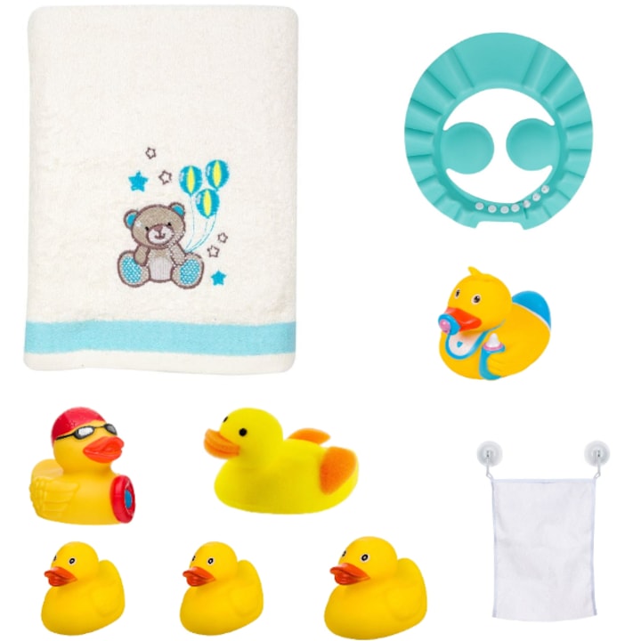 Setul complet pentru baie, care include ratuste de jucarie, un burete moale, un prosop mare din bumbac si un organizator pentru jucarii, este cadoul perfect pentru a transforma baia intr-o experienta placuta si distractiva.