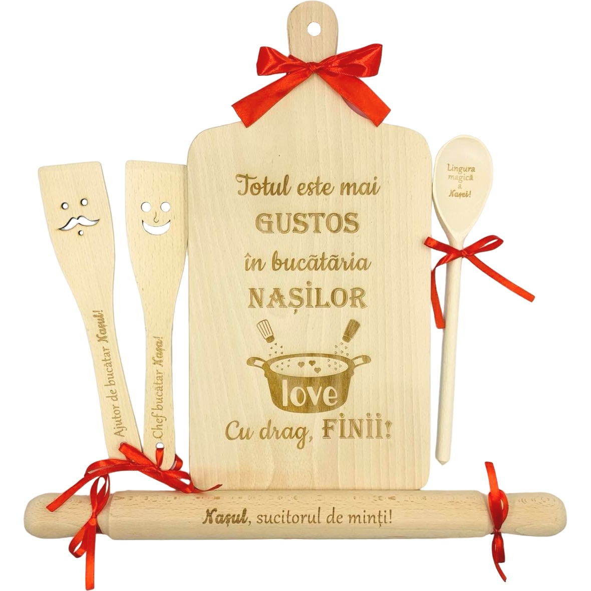 Acest set este pentru nasii care apreciaza simtul umorului. Este compus din accesorii pentru bucatarie si un tocator amuzant.